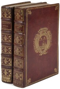 à nerfs orné de fleurs de lys, roulette dorée intérieure, tranches dorées (reliure de l’époque). Bel exemplaire en reliure de l’époque aux armes non identifiées : de gueule au navire voilé sur mer, au chef chargé de 2 étoiles. Ces armes portent une couronne comtale. Exemplaire dont le calendrier a été interfolié. Coiffe inférieure restaurée. Mouillures claires.