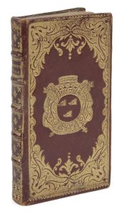 dos à nerfs orné de fleurs de lys, roulette dorée intérieure, tranches dorées (reliure de l’époque). Exemplaire bien conservé de cet almanach imprimé pour la famille royale, relié aux armes du garde des sceaux Armand Thomas Hüe de Miromesnil (1723-1796). Quelques frottements d’usage.