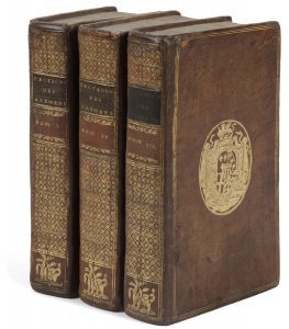 Chefs-d’Office & Chefs de Cuisine, de la Cour, & de la Ville. Paris : Gissey, Bordelet, 1750. — 3 volumes in-12, 164 x 95 : xvj, xxviij, 538 pp., (1 f.) ; (2 ff.), 576 pp. ; (2 ff.), 559 pp. Veau havane, triple filet doré en encadrement et armes dorées au centre sur les plats, dos lisse richement orné, bête à 7 têtes dorée en bas du dos, tranches marbrées (reliure de l’époque). Oberlé, 113. - Livres en bouche, n°160. - Vicaire, col. 276. Édition originale de l’ « UN DES PLUS INTÉRESSANTS RECUEILS DE RECETTES DU XVIIIe SIÈCLE » (Oberlé). Attribué à un certain Briand, présenté sur le titre comme « chef de cuisine de M. le Prince de *** », cet ouvrage est un traité complet des aliments par ordre alphabétique, donnant « leur nature, leur usage, leur propriété, relativement aux différens âges, & différens tempéramens, d’après ce qu’ont écrit les plus habiles Médecins qui ont traité cette matière : sous le même coup d’œil, les Alimens apprêtés différemment, suivant la méthode ancienne & moderne des plus habiles Chefs de Cuisine de la Cour & de la Ville » (pp. xv-xvj). En tête du premier volume figurent en plus « une liste de ce que chaque saison peut fournir de meilleur & de plus excellent, & comment des Tables de 7, 9, 11, 13 couverts, peuvent être servies, soit en maigre, soit en gras, & à combien de services » (p. xvj). L’auteur s’adresse ainsi à tous les publics, proposant de la cuisine simple « pour les Bourgeois » jusqu’à la plus délicate pour les « Sensuels », adaptant de cette façon l’alimentation à la nécessité et à l’état social. EXEMPLAIRE AUX ARMES DE JEAN-ARMAND, MARQUIS DE JOYEUSE ET DE VILLE-SUR-TOURBE (1718-1774) capitaine de cavalerie, brigadier d’infanterie puis colonel aux grenadiers de France. On trouve au dos une bête à 7 têtes qui est l’une des pièces d’armes du marquis. Les exemplaires de ce titre aux armes sont rarissimes. Coiffes et mors refaits, petit manque à la coiffe de tête des deux premiers volumes, titre au dos du troisième volume effacé, quelques taches et frottements d’usage sur les plats. Mouillures claires dans les marges. Déchirure dans la marge du feuillet Qq4 du premier volume et des feuillets Yy7 et Yy8 du second volume, sans gravité. Provenance : Jean-Armand, marquis de Joyeuse, avec ses armes sur les plats.