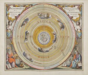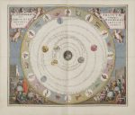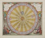 Derrière elle figurent 4 personnages dont l’astronome Claude Ptolémée montrant de son index le passage d’un livre, certainement son ouvrage l’Almageste, l’astronome et mathématicien Aristarque de Samos levant la main droite, le roi de Castille Alphonse x et l’astronome, mathématicien et pasteur Philippus Lansbergen (1561-1632). La partie supérieure représente la voûte céleste avec deux signes du zodiaque et quatre angelots dont 2 soutiennent une bannière portant le titre général de l’atlas. À ce frontispice s’ajoutent 29 cartes sur double page qui sont parmi les plus belles jamais réalisées dans l’histoire de l’astronomie ; elles sont entourées de scènes pour la majorité historiées comprenant des chérubins, des scientifiques, etc. Ces cartes sont encore aujourd’hui considérées comme celles illustrant le mieux les systèmes de Ptolémée, Copernic et Tycho Brahé. Dix d’entre elles ont été gravées par Johannes Van Loon (vers 1611-1685). On trouve également 4 figures sur cuivre dans le texte aux pages 118, 119 et 140 de la seconde partie. Cet atlas fut publié en vertu d’un privilège du 21 juillet 1660 et d’un permis d’imprimer du 27 juillet de la même année. On l’ajoute parfois en complément à l’Atlas maior de Blaeu. Les exemplaires datés 1660 sont d’une extrême rareté, la majorité portent comme ici la date de 1661. L’édition considérée comme seconde fut publiée en 1708. Tous les exemplaires reliés à l’époque ont été montés sur onglets, comme c’est le cas ici. Reliure salie, or fané par endroits.