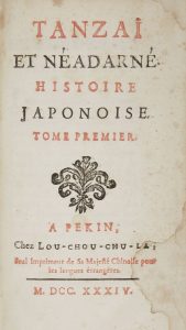 CRÉBILLON (Claude-Prosper-Jolyot de). Tanzai et Néadarné. Histoire Japonoise. Pekin [Paris] : Lou-chou-chu-la, 1734. — 2 volumes in-12, 167 x 95 : (2 ff.), pp. iv-xx, (2 ff.), 274 pp. mal chiffrées 266 ; (3 ff.), 436 pp. Veau blond, armes...