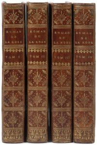 Notes & d’un Glossaire.[Et] : Supplément au glossaire du Roman de la rose, Contenant des notes critiques, Historiques & Grammaticales…Paris : veuve Pissot, 1735 (tomes 1 à 3) ; Dijon : J. Sirot, 1737 (tome 4). — 4 volumes in-12, 165 x 96 : (2 ff.), LXVI pp., (1 f.), 362 pp., (1 f. blanc) ; (1 f.), 424 pp. ; (1 f.), 384 pp. ; (1 f.), 344 pp., (6 ff.). Maroquin rouge, roulette dorée en encadrement sur les plats, dos lisse orné, roulette dorée intérieure, tranches dorées (reliure de l’époque). Brunet, III, 1175. Première édition depuis le XVIe siècle, donnée par Nicolas Langlet Du Fresnoy. Elle contient une importante préface sur la genèse et le contenu du roman, ainsi que la vie de Jean de Meung par André Thévet. Le troisième volume est entièrement consacré à des œuvres annexes : Le Codicille et Le Testament de maistre Jean de Meung, Les remonstrances de nature à l’alchimiste errant du même auteur, La Response de l’alchimiste à Nature, le Petit traicté d’alchymie, intitulé Le sommaire Philosophique De Nicolas Flamel, La fontaine des amoureux de science composée par Jean de La Fontaine de Valenciennes, et la Balade du secret des philosophes. Il se termine par le glossaire « ou explication des anciens Mots du Roman de la Rose, & autres Poësies de Jean de Meun ». Exemplaire complet du supplément publié deux ans après ces 3 volumes, contenant une dissertation sur les auteurs du roman, l’analyse de l’œuvre, un discours sur l’utilité des glossaires, les variantes restituées sur un manuscrit du président Bouhier de Savigny et une table des auteurs cités dans l’ouvrage.{CR}Séduisant exemplaire en maroquin d’époque uniforme, condition des plus rares et des plus recherchées. Le premier tome est le seul à posséder un faux titre, comme dans tous les exemplaires que l’on a pu consulter.{CR}Dos très légèrement éclaircis, taches sur le premier plat du tome 3 et sur les dos. Rousseurs éparses dans le 4e volume.{CR}Provenance : Edmond Petit, avec son ex-libris.