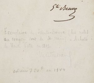 et fleuron doré aux angles sur les plats, dos à nerfs orné, roulette dorée intérieure, tranches dorées (reliure de l’époque). Seconde édition après celle donnée en 1747, de ce drame composé par le président Hénault. Elle débute par une préface digne d’intérêt dans laquelle l’auteur porte notamment une réflexion sur le rapport entre Histoire et tragédie : « Je dis, qu’abandonnant toute prétention d’Auteur Tragique, un Historien qui, au lieu de raconter des faits, les mettroit en action, trouveroit en même tems le secret d’instruire mieux que ne le fait ordinairement l’Histoire, & d’exciter dans l’ame des spectateurs la terreur & la pitié, ces deux grands mobiles de la Tragédie » (préface). La pièce est suivie de notes qui paraissent ici pour la première fois. L’édition est illustrée d’une vignette d’après Charles Nicolas COCHIN en tête du premier acte, la même que dans l’édition originale mais gravée de nouveau par Claude Duflos. Celle pour l’édition de 1747 était gravée par Soubeyran. PRÉCIEUX EXEMPLAIRE EN MAROQUIN ROUGE DE L’ÉPOQUE, AYANT APPARTENU À SAINTE-BEUVE qui a apposé sa signature autographe sur la première garde blanche. Ce dernier a également chargé de notes au crayon le feuillet blanc en regard du titre, souligné quelques passages dans la préface à la fin de laquelle il a ajouté une courte note. Il fut par la suite la propriété de l’écrivain et journaliste Auguste Vitu (1823-1891). Exemplaire imprimé sur beau papier vergé. Les coiffes ainsi que la charnière du premier plat à hauteur du premier caisson ont été très habilement restaurées. Provenances : Charles-Augustin de Sainte-Beuve, avec signature autographe sur le faux titre. - Auguste Vitu, avec note au crayon sur la garde blanche.