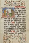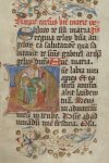 Composition du texte : f. 1 : blanc. - ff. 2 r° à 106 v°: Incipit cursus beatae Marie Virginis. - f. 107 : blanc. - ff. 108 r° à 119 r° : Psaumes de la Pénitence. - ff. 119 r° (3 dernières lignes) à 127 r° : litanies (dont Géréon, martyr de Cologne, saint Séverin, évêque de Cologne, sainte Cordula, morte à Cologne ou encore sainte Ursule, de Cologne) suivies d’oraisons. - f. 127 v° : blanc. - ff. 128 r°- 199 v° : Office ou « Vigiles » des morts, suivi de litanies et du « De Officio sepulture » (inachevé). - f. 200 : blanc. Les feuillets 201 à 268 proviennent d’un autre manuscrit de la même époque, d’une écriture différente. Le texte est de 15 lignes par page et comprend la liturgie de la Passion à l’Ascension du Christ et l’Assomption de la Vierge. Décoration : La première partie du manuscrit comprend 3 lettrines enluminées en or ainsi que quelques belles initiales : f. 2 r° : bordures florales et lettrine historiée représentant l’Annonciation. - f. 40 r° et f. 67 v°: bordures et lettrines florales. - ff. 47 v°, 55 r°, 59 v°, 72 v°, 74 v°, 77 r°, 79 r°, 83 v°, 89 v° et 95 v° : lettrines filigranées. - f. 108 r° : bordures florales et lettrine historiée représentant le roi David en prière. - f. 126 : bordures florales et lettrine historiée représentant le Christ juge entre la vierge et Saint Jean.