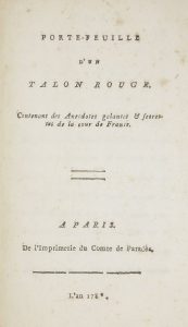 [MARIE-ANTOINETTE]. Porte-feuille d’un talon rouge. Contenant des Anecdotes galantes & secrestes de la cour de France. Paris : de l’imprimerie du comte de Paradès, [vers 1780]. — Petit in-8, 156 x 112 : 42 pp., (1 f. blanc). Veau marbré, dos...