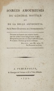 [MARIE-ANTOINETTE]. Soirées amoureuses du général Mottier et de la belle Antoinette. Par le Petit Épagneul de l’Autrichienne. Persépolis : À l’enseigne de l’Astuce et de la Vertu délaissée, 1790. — In-8, 199 x 129 : 32 pp....