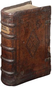Johannes Quentel, 1579. — In-folio, 336 x 203 : (20 ff.), 1102 pp. mal chiffrées 1122, (1 f.). Veau brun sur ais de bois biseautés, plats ornés d’un décor à froid composé de filets en encadrement, de fleurons aux angles et au centre d’un motif losangé fait de filets comprenant 4 compartiments ornés du même fer que les angles, restes de fermoirs en laiton, dos à nerfs, titre à l’encre sur la gouttière (reliure de l’époque). Nouvelle édition de cette célèbre chronique universelle de l’humaniste allemand Johannes Nauclerus (1425-1510). Parue pour la première fois à Tubingen en 1501 et composée sur la suggestion de l’empereur Maximilien Ier, elle couvre une période très vaste allant de la création jusqu’à la fin du XVe siècle ; elle est particulièrement recherchée en raison de la richesse des renseignements qu’elle contient, notamment pour les faits qui se sont passés du vivant de l’auteur. Elle était la chronique la plus exacte de toutes celles qui avaient paru jusqu’alors. Certaines des sources que Nauclerus donne ont aujourd’hui disparu et ne sont connues que grâce à ce texte. Bon exemplaire dans sa reliure de l’époque estampée à froid sur ais de bois. Il possède plusieurs provenances inscrites sur les gardes et le titre. Sur la première doublure se trouve une note en latin datée de 1584 donnant le nom de J. V. Lirentiatus, collège ecclésiastique à Saint-Martin (?). Ce nom figure également sur le titre. Sur la première garde blanche a été inscrite de la même main la notice du livre de Simon Schard paru en 1566 sous le titre Germanicarum rerum quatuor celebriores vetustioresque chronographi. Le titre possède également les ex-libris manuscrits de Joannis Bernardi Droste, daté de 1692, et de Petrus Strübbe, daté de 1736. Coiffes refaites, manque de cuir aux angles et sur un bord du premier plat, manque les fermoirs en cuir. Rousseurs éparses, rares traces de mouillure, déchirure dans la marge inférieure de l’avant dernier feuillet.
