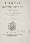 NECKER (Jacques). Compte rendu au roi. Paris : Imprimerie du cabinet du roi, 1781. — In-4, 256 x 192 : portrait, (2 ff.), 116 pp., 2 planches, 1 tableau, 2 cartes. Veau porphyre, triple filet doré en encadrement sur les plats, dos à nerfs...