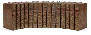 à 16). — 16 volumes in-12, 145 x 81. Veau marbré, dos à nerfs orné, tranches rouges (reliures de l’époque). Importante édition qui s’étala sur 42 années, publiée par Christophe Ballard puis par son fils Jean-Baptiste-Christophe. Il s’agit d’un ouvrage de référence, proposant le livret des 129 opéras qui se sont joués à l’Académie royale de musique de Paris depuis Pomone en 1671 jusqu’à Castor et Pollux en 1737. L’édition est illustrée de 121 planches dessinées par Franz Ertinger (1640-1710), Jean Berain (1640-1711), Ferdinand Delamonce (1678-1753) et Bonnart, gravées par Ertinger et Gérard Jean-Baptiste Scotin (1671-1716). Le volume 8 provient d’un autre exemplaire, le décor de la reliure est différent. Pièce de titre du tome 5 arrachée. Mouillures plus ou moins importantes dans chacun des volumes, quelques rares galeries de vers sans gravité. Le titre et la table du 8e volume ont été rapportés et présentent des traces de colle et quelques légères déchirures. Travaux de vers dans la marge de quelques feuillets du 11e volume.