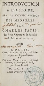 nerfs orné, tranches mouchetées (reliure de l’époque). Édition originale dédiée à Chrétien-François Ier de Lamoignon (1644-1709). Charles Patin (1633-1693) était le fils du médecin et antiquaire Guy Patin dont il reçut la collection de médailles. Composé en 1661-1662, cet ouvrage constitue l’un des principaux manuels de numismatique de l’époque. L’illustration est entièrement de François Chauveau et comprend un frontispice, un bandeau en tête de l’épître et 15 figures de médailles, dont 12 dans le texte et 3 à pleine page. On trouve également un bandeau aux armes du dédicataire en tête de l’épître.