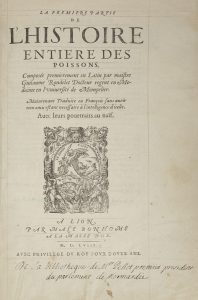 L’auteur propose une étude, tout à fait remarquable pour l’époque, à la fois historique et anatomique des poissons mais également des mammifères, des crustacés, des céphalopodes, etc. Un chapitre est même consacré aux monstres marins, tout à fait fantaisistes. Rondelet eut pour ce traité le soutien et l’aide entre autres de Conrad Gesner et du Cardinal de Tournon. Ce livre resta la référence en ichtyologie pendant plus d’un siècle et servit de base aux recherches modernes. L’édition originale latine parut pour la première fois en 1554 et 1555. La traduction française est attribuée au médecin et chirurgien Laurent Joubert (1529-1583), un des élèves de Rondelet. L’édition est illustrée d’un portrait de l’auteur répété dans les 2 parties, et de plus de 420 figures sur bois dans le texte des différents spécimens décrits, qui sont pour la grande majorité parfaitement réalistes. Baudrier attribue le portrait à Pierre Vase et les bois des animaux au peintre et graveur lyonnais Georges Reverdy. L’impression de cet ouvrage est l’une des plus belles réalisations de Macé Bonhomme. Exemplaire entièrement réglé, provenant de la bibliothèque de Claude Pellot (1619-1683), premier président du parlement de Normandie, avec son ex-libris manuscrit sur le titre et ses armes gravées et collées au verso du titre. On trouve sur la première garde la mention manuscrite du prix du livre : « Emptus 3 sols (?) Le 8 avril 1625 ».