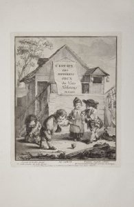 planches dessinées et gravées au burin par Augustin de Saint-Aubin (1736-1807), représentant différents jeux auxquels s’adonnaient les jeunes enfants à Paris à la fin du XVIIIe siècle : le sabot, le coupe-tête, la fossette ou le jeu de noyaux, la toupie et la corde. La dernière planche représente la sortie du collège où l’on voit des enfants sauter, courir, danser, etc. Cette série fut initialement publiée vers 1770, les exemplaires en premier tirage sont rarissimes. Celle proposée ici provient d’un tirage postérieur, probablement du milieu du XIXe siècle ; chaque épreuve comporte effectivement le tampon circulaire bleu « Seine Colportage » que l’on trouve notamment sur les estampes diffusées à cette époque. Les sujets de 218 x 180 mm ont été gravés sur un feuillet de papier vergé de 380 x 279 mmTrès belles épreuves en parfait état.