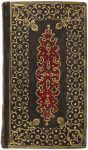 plats ornés au centre d’une pièce de maroquin rouge aux formes chantournées ornée de petits fers et ajourée par endroits, entourée d’une bordure festonnée dorée aux petits fers avec motifs de fleurs, de quadrilobes, de points et de grenades, double filet doré à l’extérieur ; dos lisse compartimenté en six caissons par une roulette dorée, les caissons, à l’exception de la pièce de titre, étant ornés de petits fer dorés et d’un pièce losangée de maroquin rouge (caisson 1), d’un fer à la tulipe (caissons 3 et 5), d’une figure polylobée mosaïquée de maroquin rouge (caisson 4) et d’un quadrilobe aux lobes pointus (caisson 6) le tout orné de petits fers dorés ; roulette dorée intérieure, doublures et gardes de papier doré à motifs floral en réserve, tranches dorées (Atelier des petits classiques). Willems, 449. Véritable édition elzévirienne, imprimée à Leyde par Abraham et Bonaventure Elzevier.
