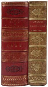 pp. 879-996, (2 ff.). Maroquin rouge, filet et roulette dorés en encadrement sur les plats, dos lisse orné, filets dorés intérieurs, tranches dorées (reliure de l’époque). Bon exemplaire en maroquin rouge de l’époque. Le titre comporte le cachet de la bibliothèque de la cour, répété au dernier feuillet. Quelques frottements et traces d’usage sur les plats, sans gravité. Petit coup à la coiffe inférieure, coins légèrement émoussés. Rousseurs éparses, pages 57 à 62 rapportées. On joint :{CR}- ALMANACH ROYAL ET NATIONAL, pour l’an M. DCCC. XXXIII, présenté à sa majesté et aux princes et princesses de la famille royale. Paris : A. Guyot et Scribe, 1833. — In-8, 208 x 121 : (2 ff.), 984 pp., (2 ff.), 4 pp. Basane racinée, dos lisse orné, tranches marbrées (reliure de l’époque). Exemplaire portant la signature de La Tour Maubourg sur le faux titre. Un des possesseurs a indiqué qu’il s’agit de la signature de l’ambassadeur et homme politique Rodolphe de Faÿ de La Tour-Maubourg (1787-1871) mais il pourrait également s’agir du diplomate et parlementaire Florimond de Faÿ de La Tour Maubourg (1781-1837).Quelques coups sur le bord des plats, un coin frotté.
