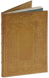 entrelacs dans le style de la Renaissance, dos à nerfs orné dans le même esprit, doublures de maroquin citron orné d’une dentelle dorée en encadrement et d’un décor à répétition fait d’une succession de croix dans un compartiment en forme de losange stylisé aux bords droits et courbes, gardes de soie moirée verte, tranches dorées (Ateliers Mame). Vicaire, I, 575.{CR}Première édition des poésies pieuses de Catherine d’Amboise (1481-1550). Elle fut publiée par l’abbé Jean Jacques Bourassé (1813-1872) pour la Société des bibliophiles de Touraine d’après le manuscrit 8033 de l’ancien fonds français de la Bibliothèque Nationale. EXEMPLAIRE PROBABLEMENT UNIQUE SUR PEAU DE VÉLIN, luxueusement relié par un maître relieur des ateliers Mame. La justification n’indique que 70 exemplaires sur papier vergé et 110 sur papier chamois ; Vicaire ne fait également aucune mention d’exemplaire sur peau de vélin.Exemplaire vraisemblablement de l’éditeur, parfaitement conservé, ne présentant que d’infimes frottements aux charnières.