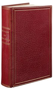 341 pp., (1 f.), couverture imprimée ; (2 ff.), 397 pp., (1 f.), couverture imprimée. Maroquin grenat, double filet doré en encadrement sur les plats, dos lisse orné, dentelle dorée intérieure, tranches dorées, couverture conservée (Bretault). Belle édition imprimée par Jouaust pour la collection des « Conteurs français » des œuvres de l’homme de lettres et conteur Nicolas de Cholières (1500-1592).