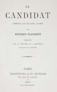 FLAUBERT (Gustave). Le Candidat. Comédie en quatre actes.{CR}Paris : Charpentier et Cie, 1874. — In-16, 158 x 122 : (4 ff. premier blanc), 165 pp., (1 f. blanc). Demi-chagrin vert, dos à nerfs orné, non rogné (reliure de l’époque). Édition...