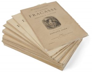 GAUTIER (Théophile). Le Capitaine Fracasse. Illustré de 60 dessins de Gustave Doré. Paris : Charpentier, 1866. — 58 livraisons in-8 (sur 60), sous couverture jaune illustrée, réunies dans une chemise et un étui. Premier tirage de la...