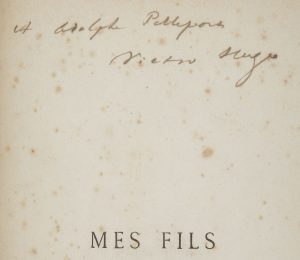 ENRICHI SUR LE FAUX TITRE DE CET ENVOI AUTOGRAPHE SIGNÉ DE L’AUTEUR : A Adolphe Pelleport Victor Hugo Adolphe Pelleport (1842-1881) était un poète, mort dans sa 39e année seulement. Il était un grand admirateur de Victor Hugo qui le reçut assez régulièrement à Guernesey à partir de 1863 et qui le surnommait « le jeune Toutou Pelleport ». Peu après sa mort survenue en mai 1881, Hugo écrivit ces mots à sa mère : « Vous étiez la mère, la mère vénérée d’Adolphe Pelleport ; j’étais presque son père ». Cette relation presque paternelle avouée par l’auteur des Misérables, rend la provenance de cet exemplaire de Mes fils d’autant plus touchante.