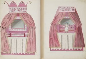 Il s’agit de celui du collectionneur Arthur Maury (1844-1907), grand philatéliste et vice-président de la Société des Amateurs de jeux et jouets anciens, que Henry René d’Allemagne utilisa comme un des principaux documents d’étude pour son livre devenu l’une des références en la matière intitulé Histoire des jouets (1902). On y trouve effectivement la reproduction, avec parfois quelques variantes, de quelques-uns des jouets figurant également dans ce catalogue. D’Allemagne, page 20 de son ouvrage, donne la description suivante de l’album : « Cet album, qui date des premières années de l’Empire, devait servir de référence à quelque commissionnaire en marchandises et faire partie d’une série de recueils où toutes les branches de l’industrie parisienne se trouvent représentées. Il est composé de cinquante feuillets doubles qui donnent des modèles coloriés exécutés en grandeur naturelle de toutes les poupées, de leurs meubles ainsi que des ménages à leur service ; en outre, on y rencontre la représentation d’animaux en carton moulé, garnis de leur musique à soufflet ou d’un mécanisme ingénieux permettant de les faire mouvoir. Les soldats étrangers, et particulièrement les Allemands, sont abondamment représentés dans ce recueil, on y voit défiler tous les uniformes du commencement du dix-neuvième siècle ; à côté des jouets, on a reproduit également quelques jeux, tels que le volant au cornet, des arcs et des flèches, etc… CE VOLUME PEUT ÊTRE CONSIDÉRÉ COMME LE PLUS PRÉCIEUX DOCUMENT QUE NOUS POSSÉDONS À L’HEURE ACTUELLE SUR L’INDUSTRIE DU JOUET AU DÉBUT DU XIXe SIÈCLE ».