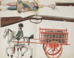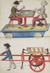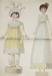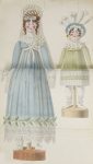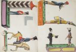 Cette description correspond en tout point au présent album, à ceci près que ce dernier comporte 55 feuillets dont 38 doubles et 17 simples et non 50 doubles. Cette différence s’explique du fait que la reliure permet, à l’aide des deux rivets présents sur le premier plat, de retirer ou d’ajouter des feuillets. D’Allemagne n’a semble-t-il pas eu accès à tous les feuillets mais a pu également en voir d’autres qui ne figurent pas ou plus dans le recueil comme le laisse suggérer les deux ou trois jouets dont il donne la reproduction et qui ne se trouvent pas dans l’album. Dans l’état où nous le proposons, il correspond au recueil tel qu’il a été vendu à la vente d’Arthur Maury en 1908, dont la notice était : « Références d’un fabricant de jouets sous le Premier Empire. Rare et curieuse réunion de 55 pl. coloriées de poupées, soldats et jouets divers de l’époque. En une reliure interchangeable. » On y trouve représentés plus de 300 jouets dont, en plus de ceux mentionnés par d’Allemagne dans sa description, des articles de ménage pour enfants, des arlequins, des polichinelles, des jouets mécaniques, des instruments de musique, des armes factices, etc. Le tout a été peint à la gouache ou à l’aquarelle sur papier vergé fort. Chaque sujet a été représenté en grandeur nature, d’où des rajouts de papier à certains dessins, et porte un numéro d’inventaire accompagné quelques fois de commentaires et presque toujours de lettres qui nous sont restées énigmatiques, certaines semblant indiquer un prix ; le premier dessin est par exemple accompagné de cette indication : « 19356 n ep pièce ». Parmi les nombreuses poupées représentées, figure celle « en grand costume du Directoire, ornée d’un chapeau à plume, les jambes enveloppées dans un vaste pantalon flottant » (d’Allemagne p. 118). Il s’agit de la poupée la plus réaliste de l’album et le visage n’est pas sans rappeler celui du petit prince impérial, le roi de Rome. Elle est entourée de deux autres poupées représentant une religieuse et un père capucin.