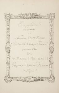 (reliure de l’époque). Réimpression sur papier vélin de Rives, peut-être unique, de ce superbe livre de fêtes, spécialement tiré par ordre du président de la République Félix Faure pour être offert à l’empereur de Russie Nicolas II lors de sa visite en France en octobre 1896. L’édition, entièrement gravée à l’aide des plaques originales de la chalcographie du Louvre, est de format in-plano ; les feuillets sont montés sur onglets. Elle débute par un feuillet de dédicace à l’empereur de Russie, spécialement réalisée pour l’édition, suivi de la réimpression des planches de l’édition originale du XVIIIe siècle. Ces dernières comprennent un titre gravé, un poème dédié à la religion (2 planches), un avertissement (3 planches) puis 9 grands tableaux sur double page représentant les différents moments du sacre, depuis le levé du roi jusqu’au festin royal, chacun accompagné de 2 ou 3 feuillets de description et d’une explication des figures allégoriques répondant au tableau. L’ouvrage se termine par 30 planches de costumes, ceux du roi et des principaux personnages ayant participé ou assisté au sacre, et par un feuillet double de table. Le texte a été rédigé par Danget ; les planches ainsi que les cartouches et les bordures ont été réalisés par Audran, Beauvais, Cochin père, Desplaces, Duchange, Dupuis, Larmessin, Tardieu, Edelinck, Chereau, Drevet, Haussard et Petit. Nous n’avons pu répertorier aucun autre exemplaire de cette réimpression qui est d’une remarquable qualité, faite à partir des cuivres originaux. Exemplaire parfaitement conservé, si ce n’est les coins émoussés et des frottements aux nerfs. À l’intérieur, on note simplement de légères salissures au premier feuillet et quelques déchirures et des traces de feutre rouge dans les marges de la planche du festin royal.