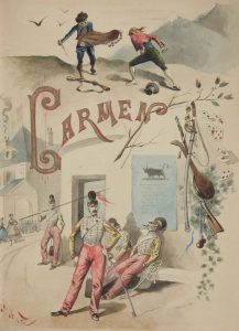 MÉRIMÉE (Prosper). Carmen. Paris : Calmann Lévy, 1884. — In-8, 180 x 131 : (2 ff.), 147 pp., couverture imprimée. Veau bleu gris marbré, large et riche encadrement doré sur les plats, dos lisse orné, roulette dorée intérieure, tête...