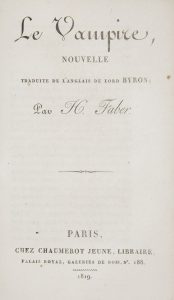 [POLIDORI (John)]. Le Vampire, nouvelle traduite de l’anglais de lord Byron ; Par H. Faber. Paris : Chaumerot jeune, 1819. — In-8, 194 x 120 : (2 ff.), 62 pp. Demi-veau blond, dos lisse orné, tranches marbrées (reliure de l’époque)....