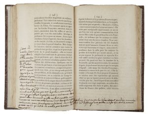 Précieux exemplaire chargé de notes manuscrites d’un autre témoin oculaire, Claude Antoine de Béziade, marquis puis duc d’Avaray (1740-1829). Militaire et homme politique, il fut élu par la noblesse de l’Orléanais le 1er avril 1789 député aux États généraux de 1789 et siégea à l’Assemblée constituante. Emprisonné en 1793, confiné dans son château d’Avaray sous l’Empire, il retrouva les faveurs de son rang sous la restauration où Louis XVIII le nomma lieutenant-général en 1814, pair de France en 1815 et membre du Conseil d’administration de l’hôtel des Invalides en 1816. En 1820 il fut fait chevalier des ordres du Roi, devint premier chambellan, officier de l’ordre royal de la Légion d’honneur puis gouverneur de la 19e division militaire. Les notes qu’il met ici dans la marge sont d’une grande importance car elles viennent pour certaines confirmer ou infirmer les dires de Sallier et parfois les développer. D’Avaray donne également quelques clés sur certains personnages que la prudence a empêché Sallier de nommer clairement. Le marquis s’identifie dans certaines de ses notes, sans se nommer, notamment à la page 156 où il est question d’un lit de justice où il indique dans la marge : « en qualité de lieutenant gal de l’orléanais j’avois été averti pour suivre le roi à ce lit de justice. je n’ai jamais vu de cérémonie plus lugubre ».