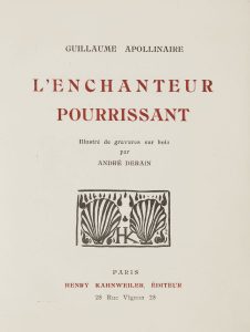 APOLLINAIRE (Guillaume). L’Enchanteur pourrissant. Illustré de gravures sur bois par André Derain.{CR}Paris : Henry Kahnweiler, [27 novembre 1909]. — In-4, 270 x 201 : (42 ff. premier et dernier blancs), couverture muette. Broché. ÉDITION...