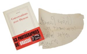 BRASSAÏ. Conversations avec Picasso. Paris : Gallimard, [1964]. — In-8, 205 x 139 : 334 pp., (3 ff.), 24 ff. de planches, couverture imprimée. Broché, couverture rempliée. Édition originale illustrée de 53 photographies de l’auteur...