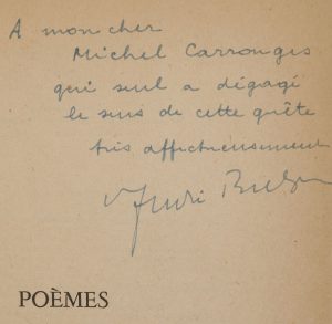 BRETON (André). Poèmes. Paris : Gallimard, [1948]. — In-8, 207 x 140 : 271 pp., couverture imprimée. Broché. Édition collective, en partie originale. Exemplaire du service de presse, enrichi de cet envoi de l’auteur à Michel Carrouges...