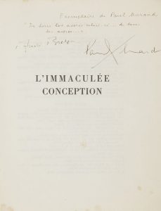 Devauchelle. Édition originale. Un des 2000 exemplaires numérotés sur papier impondérable des papeteries Sorel-Moussel. PRÉCIEUX EXEMPLAIRE DE PAUL MORAND, portant cet envoi autographe signé de Breton et contresigné par Paul Éluard : Exemplaire de Paul Morand « De tous les astres celui-ci… de tous les astres… » André Breton Paul Éluard La citation provient du chapitre intitulé « La Vie », pages 19-20. Exemplaire parfaitement conservé dans une chemise et un étui de Devauchelle. Rousseurs sur les tranches. Joint le prospectus de parution illustré. Provenances : Paul Morand, avec envoi autographe. - Heilbronn, avec ex-libris.