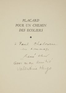 CHAR (René). Placard pour un chemin des écoliers. Paris : GLM, [1937]. — In-8, 250 x 192 : (22 ff., 2 premiers et 2 derniers blancs), couverture imprimée. Broché. Édition originale tirée à 334 exemplaires, illustrée de 4 compositions à...