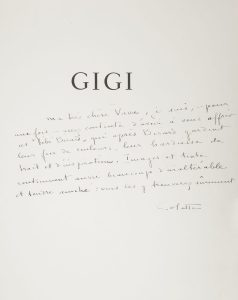 COLETTE. Gigi. Paris : [Paul Chadourne], 1950. — In-4, 330 x 257 : 128 pp., (4 ff. deux derniers blancs), couverture illustrée. En feuilles, couverture rempliée, chemise cartonnée et étui d’édition. Édition qui avait été commencée par...