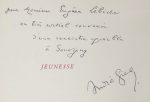 GIDE (André). Jeunesse. Neuchâtel, Paris : Ides et Calendes, [1945]. — In-12, 186 x 141 : 50 pp., (3 ff.), couverture illustrée. Maroquin beige janséniste, dos à deux nerfs, tête dorée, non rogné, couverture conservée (reliure de...