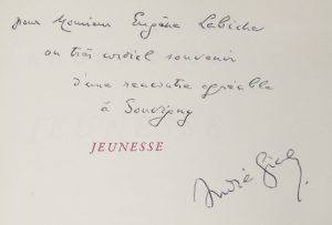 l’époque). Première édition en librairie, ornée d’une vignette dessinée par Henri Matisse reproduite sur la couverture. Un des 200 exemplaires d’auteur sur vélin blanc parmi les 1500 sur ce papier, celui-ci enrichi de cet envoi autographe d’André Gide à Eugène Labiche, petit-fils du célèbre auteur dramatique : pour Monsieur Eugène Labiche en très cordial souvenir d’une rencontre agréable à Souvigny. André Gide Dos et bords des plats légèrement brunis.