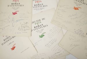 Il fut tiré à 40 exemplaires sur papier vélin pur chiffon des papeteries d’Arches. Exemplaire non numéroté et non signé. - Déjeuner du prix du Roman d’Aventures. Donné à Paris le 12 juin 1946. 2 ff. in-folio, 323 x 249. Menu illustré d’une composition en noir de GUS BOFA. Il fut tiré à 60 exemplaires nominatifs, celui-ci spécialement imprimé pour l’illustrateur Jean Bernard (1913) qui créa près de 210 couvertures pour la collection « Le Masque ». Il est enrichi d’un envoi accompagné de la signature de 9 des membres du jury dont Gus Bofa et Francis Carco ainsi que d’une seconde illustration de Gus Bofa intitulée Résurrection. - Déjeuner du prix du roman d’aventures. Donné à Paris le 16 juin 1947. 2 ff. in-folio, 326 x 250. Menu illustré de 2 compositions en noir de GUS BOFA. Tirage à 55 exemplaires nominatifs, celui-ci imprimé pour Jean Bernard, enrichi d’un second tirage des deux dessins et d’un envoi de 9 des membres du jury dont Francis Carco et Albert Pigasse. - Déjeuner du prix du roman d’aventures. Donné à Paris le 22 juin 1948. 2 ff. in-folio, 320 x 249. Menu illustré de 2 compositions en noir de GUS BOFA. Tirage à 70 exemplaires nominatifs, celui-ci imprimé pour Jean Bernard, enrichi d’un second tirage d’un des dessins, de la reproduction d’un autre dessin de l’artiste, de plus petit format et d’un envoi de 11 des membres du jury dont Francis Carco, Gus Bofa, Serge (avec dessin), Albert Pigasse, etc. - Déjeuner du prix du roman d’aventures. Donné à Paris le 15 juin 1949. 2 ff. in-folio, 332 x 256. Menu illustré d’une composition en noir de GUS BOFA. Tirage à 58 exemplaires nominatifs, celui-ci imprimé pour Jean Bernard, enrichi d’un envoi de 8 des membres du jury dont Francis Carco.{CR}Les 7 menus suivants datent d’entre 1961 et 1973 et ont été imprimés entre 95 et 105 exemplaires. Les dîners furent cette fois-ci donnés au château de Cheverny. Les 5 premiers sont de format in-folio et sont respectivement illustrés par DIGNIMONT (10 juin 1961, 23 juin 1962 et 15 juin 1963) et OBERTHUR (19 juin 1965 et 3 juin 1967).