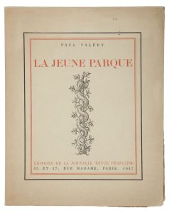 marquant le retour de Paul Valéry à la poésie et qui passe pour l’un des poèmes les plus obscurs de la poésie française. Le tirage a été strictement limité à 600 exemplaires. Un des 575 sur vergé d’Arches, très bien conservé malgré de petites taches d’encre sans gravité sur la couverture.