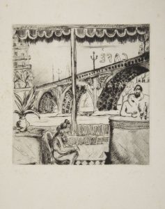 comprenant le nom des auteur et le titre à froid sur des pièces de maroquins, encadrement de box brun et listel de maroquin noir en encadrement à l’intérieur (Mirabelle). Très rare recueil tiré à seulement 26 exemplaires, réunissant 20 poèmes de Jean-Louis Vallas décrivant des ponts de Paris, chacun accompagné d’une gravure originale représentant le pont correspondant par Robert Naly. Il s’agit du premier recueil du poète Jean-Louis Vallas (1901-1995), pour lequel il reçut le Prix de poésie populiste 1949, le prix A. Drouin, le grand Prix de poésie des Rosati d’Artois et la Rose d’honneur des Rosati de France en 1956. Robert Naly (1900-1983) était un peintre, décorateur, graveur et lithographe suisse qui vécut et travailla à Montmartre et à Montparnasse. Il fut l’un des principaux représentants de la première École de Paris. Les 20 gravures qu’il propose ici sont faites selon différentes techniques (pointe sèche, eau-forte aquateintée, eau-forte, sucre, burin aquateinté, vernis mou, burin, roulette et sucre, gravure au velo et manière noire). Chaque poème avec la gravure correspondante a été imprimé sur un papier différent (papiers anciens, Ingres rose et blanc, Fabriano, Auvergne, Hollande, Madagascar, Japon impérial et nacré, Marais, Arches, Rives, Chine, Montval, etc.).{CR}Un des 20 exemplaires numérotés en chiffre romain, comprenant toutes les gravures numérotées et signées par l’artiste.{CR}Dos de la chemise passé et frotté. Listel de maroquin noir en partie décollé au premier contreplat. Sans l’étui. Rousseurs éparses.