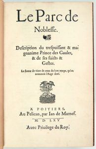 [BOUCHET (Jean)]. Le Parc de noblesse. Description du trespuissant & magnanime prince des Gaules, & de ses faicts & gestes. La forme de vivre de ceux du bon temps, qu'on nommoit l'Aage doré. Poitiers, Jean de Marnef, 1565.