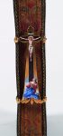 Enfin, la reliure se recommande par la présence d'un fermoir en or en forme d'hermine, pièce d'armes de la famille de Vivonne: il est orné sur le recto d'une peinture sur émail représentant la Crucifixion avec Marie Madeleine agenouillée au pied de la Croix.