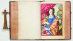 Manuscrit petit in-12 (104 x 72 mm) de (8) ff. blancs, 1 planche d'armoiries sur peau de vélin, 1 encadrement ornemental peint sur peau de vélin, 49 pp. de prières, (154) ff. blancs, 10 peintures sur peau de vélin: galuchat noir, dos lisse encadré d'un triple filet doré avec hermine dorée au centre, double encadrement d'un triple filet doré avec hermines dorées aux angles et au centre sur les plats, doublures de maroquin gris-vert entièrement décorées d'une dorure au pointillé avec un motif central quadrilobé enfermant une hermine dorée, doubles gardes de papier teint en rouge, tranches peintes, dorées et ciselées, fermoir en or en forme d'hermine ornée d'une peinture sur émail représentant Marie Madeleine au pied de la croix avec prière gravée au verso (reliure de l' époque).