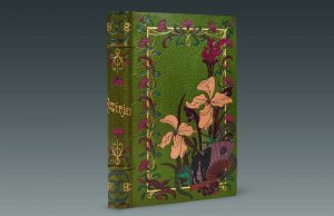Grand in-8: maroquin vert, dos à quatre nerfs et plats recouverts d'un décor floral doré et mosaïqué avec, sur le premier plat, un chat, un serpent et un éventail, coupes filetées or, doublures de maroquin brique recouvertes d'un semé de têtes de chat mosaïquées en plusieurs tons, gardes de soie brochée rouge, noire et verte, tranches dorées, couvertures et dos illustrés conservés, chemise (Charles Meunier, 1898).