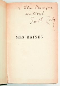 Romancier naturaliste et auteur dramatique, Léon Hennique (1850-1935) fit partie, un an après avoir reçu Mes haines, du groupe qui composa les Soirées de Medan, avec Alexis, Céard, Huysmans, Maupassant et Zola. Hennique y publia L'Affaire du grand 7. C'est une autre affaire, celle concernant le capitaine Dreyfus, qui devait le séparer de Zola dont il ne partagea pas l'engagement. Par la suite, exécuteur testamentaire d'Edmond de Goncourt, il présida l'Académie Goncourt de 1907 à 1912.