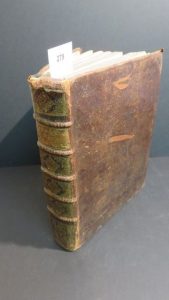 Reliure solide avec des défauts d'usage, coiffe en partie arrachée.
