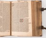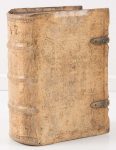 In-8, (30)-ccccc ff.- (55) Plein vélin estampé de motifs poussés à froid aux plats, dos à nerfs, fermoirs métalliques et lanière de cuir. Bible gothique imprimée par Jacques Mareschal pour Simon Vincent, dont la marque orne le titre et le dernier feuillet.