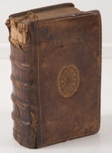 Plein veau, dos à nerfs orné, plats décorés d’un encadrement doré, et d’un cachet doré au centre, le nom du propriétaire a été enlevé par grattage. Nombreuses annotations à l’encre en page de garde et au cours du texte.