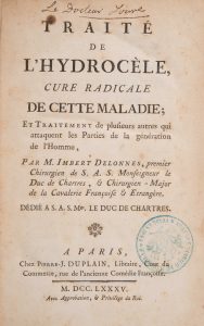 [MÉDECINE] IMBERT DELONNES (Ange-Bernard). - Traité de l'hydrocèle, cure radicale de cette maladie ; et traitement de plusieurs autres qui attaquent les parties de la génération de l'homme. Paris, Duplain , 1785,