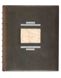 Maroquin vert, sculpture insérée sur le plat supérieur présentant deux têtes de personnages, titre argenté en long sur le dos, doubles gardes papier fantaisie et papier de soie doublé de maroquin, toutes tranches argentées, dans étui.